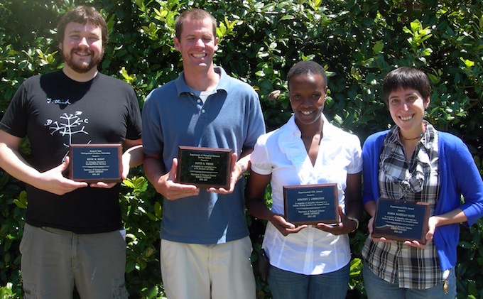 The Department of Biological Sciences announced the recipients of the 2011 Graduate Student Awards as (from left to right):
