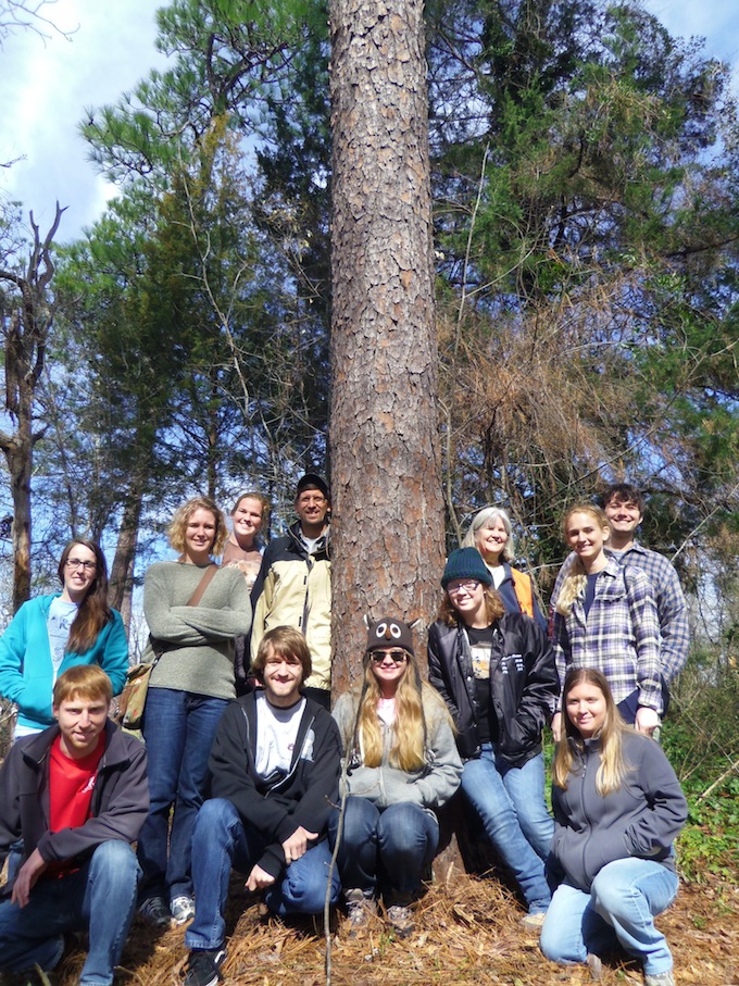 Eleven members of Auburn University’s chapter of the Society for Conservation Biology (SCB) enjoyed a forest restoration workshop presented by Dr. Sharon Hermann and Dr. John Kush. Starting with a brief Powerpoint presentation on forest history and restoration in Alabama, we then visited two field sites on campus. One site hosted longleaf pines more than 200 years old but which has not been managed with fire to maintain its original community, whereas the other site (a planted pine stand) has been thinned, burned and planted with longleaf pine seedlings. This was an excellent chance for students to talk to these experts and learn about forest restoration and fire ecology!