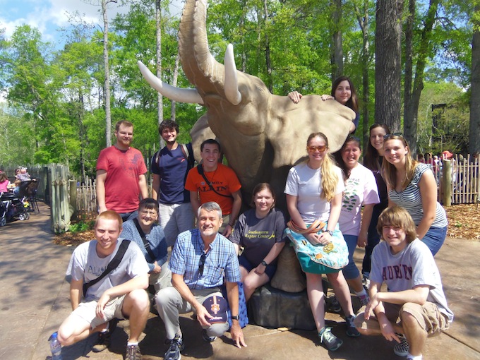 Thirteen members of Auburn University’s chapter of the Society for Conservation Biology (SCB) traveled to Birmingham on a beautiful spring Saturday (March 24) to visit both the Zoo and Botanical Gardens. Arriving first at the Zoo, we had time to wander the exhibits as well as getting a tour of the Primate Exhibits from a keeper. We then saw the Sea Lion show and went behind the scenes with two of the trainers to see those marine mammals close-up and learn more about the challenges and rewards of working with them. Moving to the Gardens across the street in the afternoon, we enjoyed a 1.5-hour guided walk led by John Manion (Curator of the Kaul Wildflower Garden) and saw a great many Alabama native plants in full bloom. Emphasized on the tour were some of the rare Alabama plants grown at the garden, including the rarest fern in the state: this species (Tutwiler’s Spleenwort) is being propagated in their greenhouses for possible conservation uses in the future.
