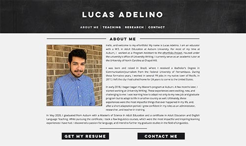 Before you begin making your ePortfolio, consider who your audience is, what your professional goals for the ePortfolio are, and how you can create a personal brand that helps achieve those goals with that audience. Creating a personal brand will help you develop a coherent story with a consistent message. Once you know the personal brand you would like to communicate, draft your About Me section and work themes from your personal brand into the reflective writing that accompanies your artifacts.
