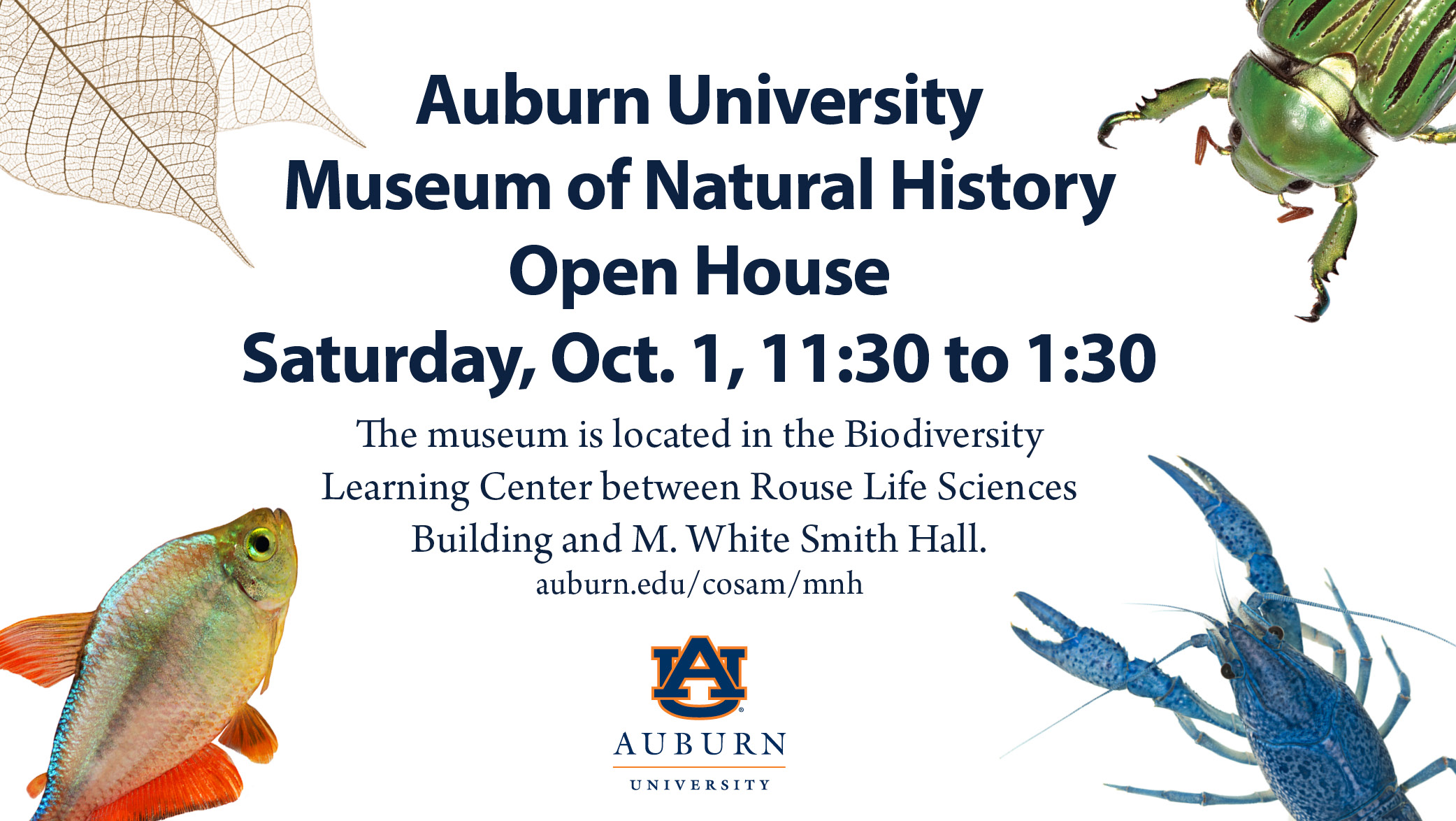 The Auburn University Museum of Natural History will host the annual Open House on Homecoming Saturday, Oct. 1, from 11:30 a.m. to 1:30 p.m. The Open House is an opportunity for the public to meet museum curators and staff, and explore the more than 2 million specimens found in the museum’s 10 collections. Visitors will also enjoy giveaways and live animal demonstrations. The Museum of Natural History is located in the Biodiversity Learning Center on the Auburn University campus between Rouse Life Sciences Building and M. White Smith Hall. For more information on the Auburn University Museum of Natural History go to auburn.edu/cosam/mnh.