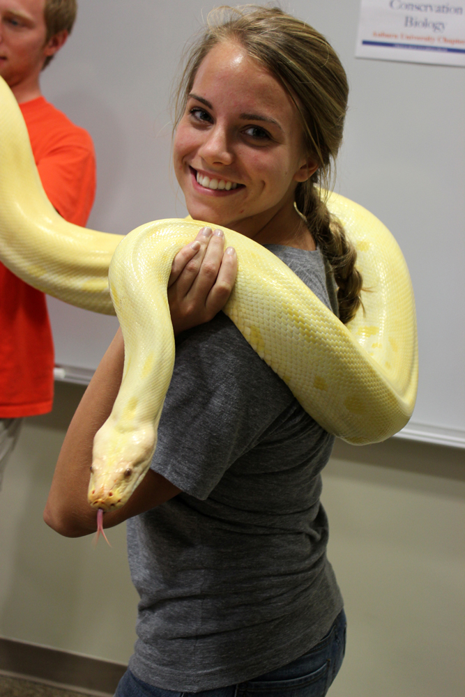 On Wednesday, Aug. 29, the college welcomed new students at the annual COSAM Open House. The Open House featured a visit by Auburn’s beloved mascot, Aubie, giveaways, food and fun as representatives were present from Pine Mountain, Georgia's Wild Animal Safari. On display was an albino python, a serval and other exotic animals. Students had an opportunity to interact with each animal on display. Also at the open house were booths representing various organizations that would interest COSAM students, including The Society for Conservation Biology, which sponsored Wild Animal Safari.