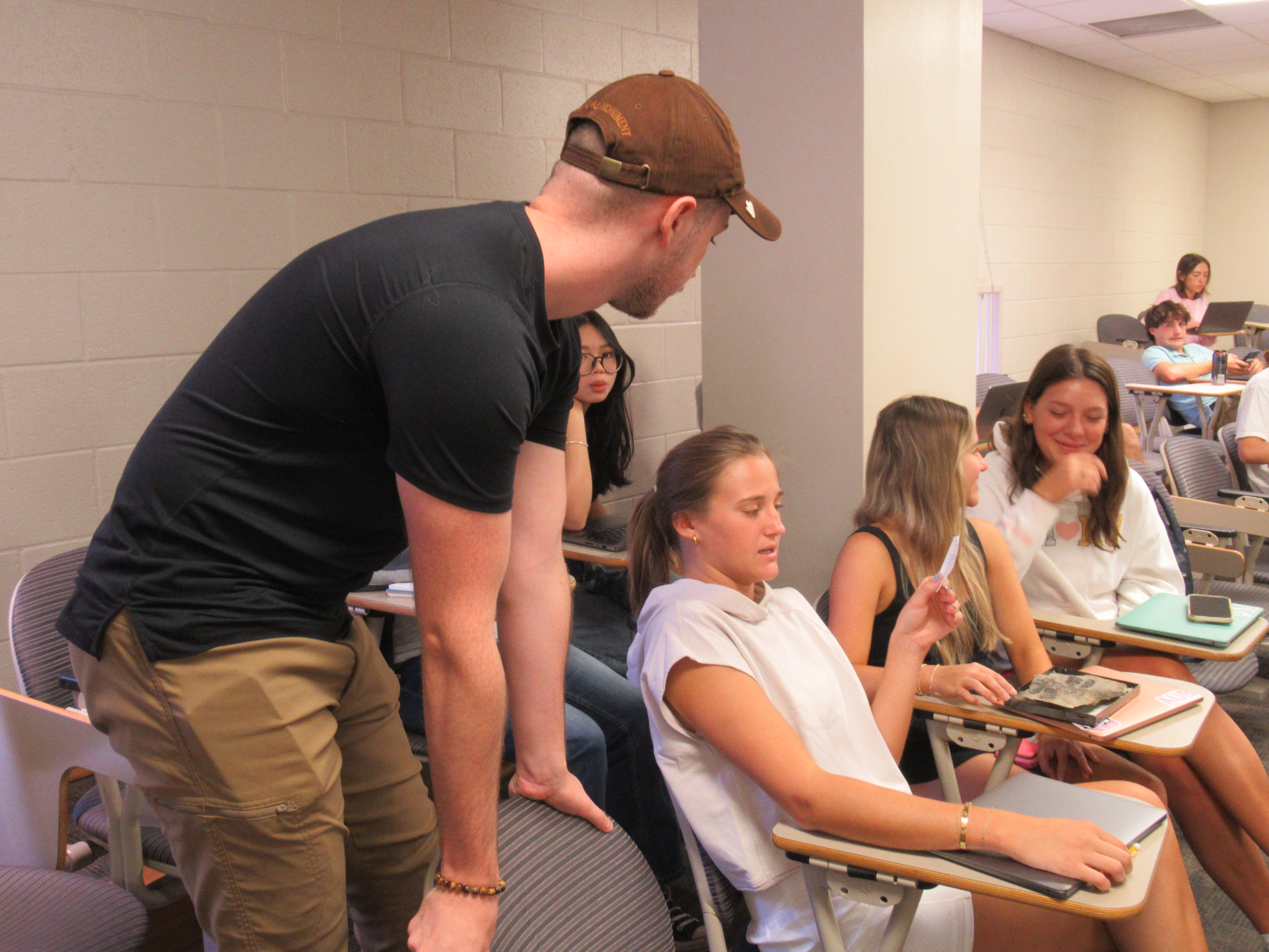 -LA Zach Champion (standing) working with students Bailey Griner, Bella Gabrovic, Sara Blanks (left to right)
