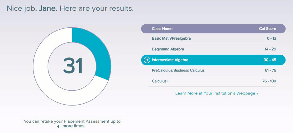 You can retake the Placement Assessment up to 2 additional times to improve your score. (The highest score will be used for math placement). Students are required to work in the Prep and Learning Modules for a specific amount of time prior to each Placement Assessment to increase success.