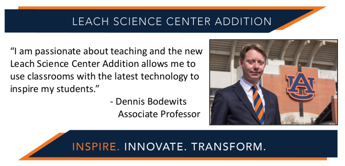The new Leach Science Center Addition is inspiring faculty in the College of Sciences and Mathematics (COSAM). Dr. Dennis Bodewits, an astrophysicist in the Department of Physics, currently teaches quantum physics and looks forward to teach astronomy classes in the new facility this fall. “I am passionate about teaching Auburn students about physics and the new Leach Sciences Center Addition allows me to engage and inspire my students with the latest classroom technology,” said Dr. Bodewits. With this new facility, he will be able to make astronomy come to life for students. The new audiovisual features make it much easier to use high quality images in class to visually tell the story of planets and galaxies. “I am also excited about the astronomy terrace,” he explained. “This new innovative, roof-top terrace with over a dozen of state-of-the-art telescopes will allow students to take their own photos of the solar system through and then provide hands-on research experience in analyzing these photos.” View the webcam of the construction of this new facility and find out more about the Leach Sciences Center.