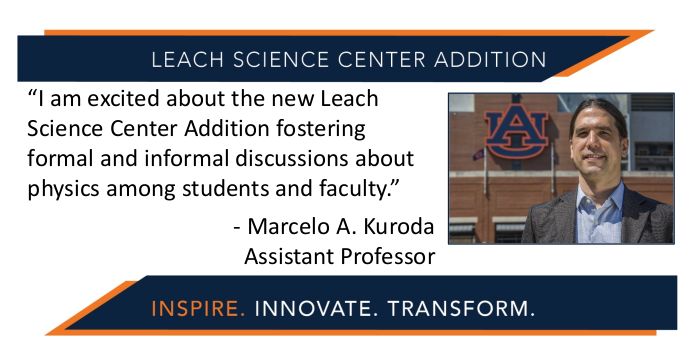 Dr. Marcelo A. Kuroda is inspired by the open spaces in the new Leach Science Center Addition. “The design of the classrooms and areas for informal meetings will help foster further discussions for both faculty and students in the Department of Physics,” he explained. “I think the new facility’s design will offer an ideal environment for incubation of new ideas in collaborative research and the two-way talk discussions between students and faculty in their physics instruction.” Dr. Kuroda currently teaches solid state physics to students at Auburn University. He is also looking forward to the technology in the new Leach Sciences Center Addition. “The technology in the classroom is not only a formidable tool to help students get the most out our classes but also an indispensable skill to join the competitive STEM (science, technology and mathematics) workforce in this day and age,” he added.