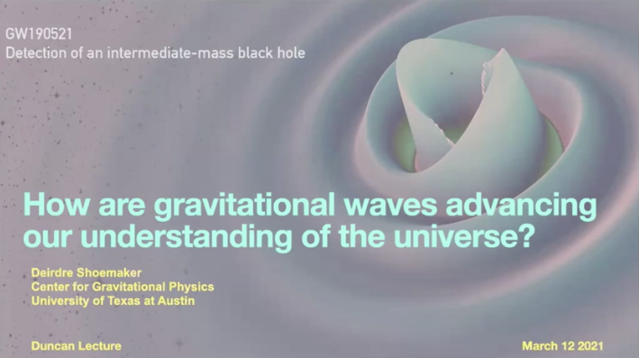The annual Duncan Lecture was held on April 23, and featured Bradley M. Peterson, professor and chair of the Department of Astronomy at The Ohio State University and a member of the NASA Advisory Council’s Science Committee and chair of the Astrophysics Subcommittee. The title of his lecture was, “Solving the Quasar Mystery: A 50-Year Quest,” and featured discussion of quasars, which are among the most distant and intrinsically brightest objects in the universe, but also small and dense. Quasars are powered by spectacularly massive “black holes,” objects so dense that not even light can escape from them. Peterson related the story of how quasars and supermassive black holes and their role in the cosmos have come to be understood.