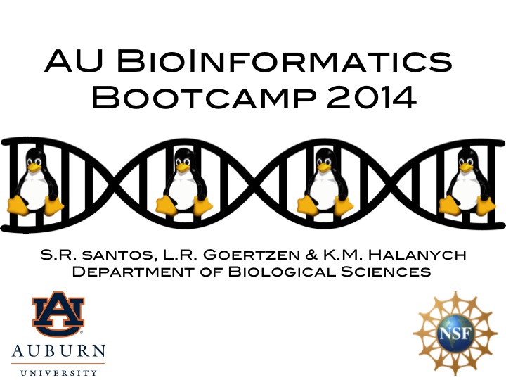 From May 19-23 Auburn will host 31 researchers representing nine institutions in the U.S., Canada and Germany participating in a genomic analysis workshop or “Bioinformatics Bootcamp”. Initiated by the NSF-funded WormNet2 grant, the workshop will train participants in various aspects of next-generation DNA sequencing data manipulation including genome mapping, assembly, annotation and phylogenomic analyses. Faculty, postdoctoral fellows, graduate and undergraduate student teams will attend lectures and collaborate on group projects using AU supercomputing resources. Biological Sciences faculty Scott R. Santos, Les R. Goertzen and Ken M. Halanych will provide instruction. Registration for this week’s workshop is closed but efforts to develop a regular workshop to promote bioinformatic training are underway. A PDF of the 2014 Bioinformatics Bootcamp syllabus can be found here.