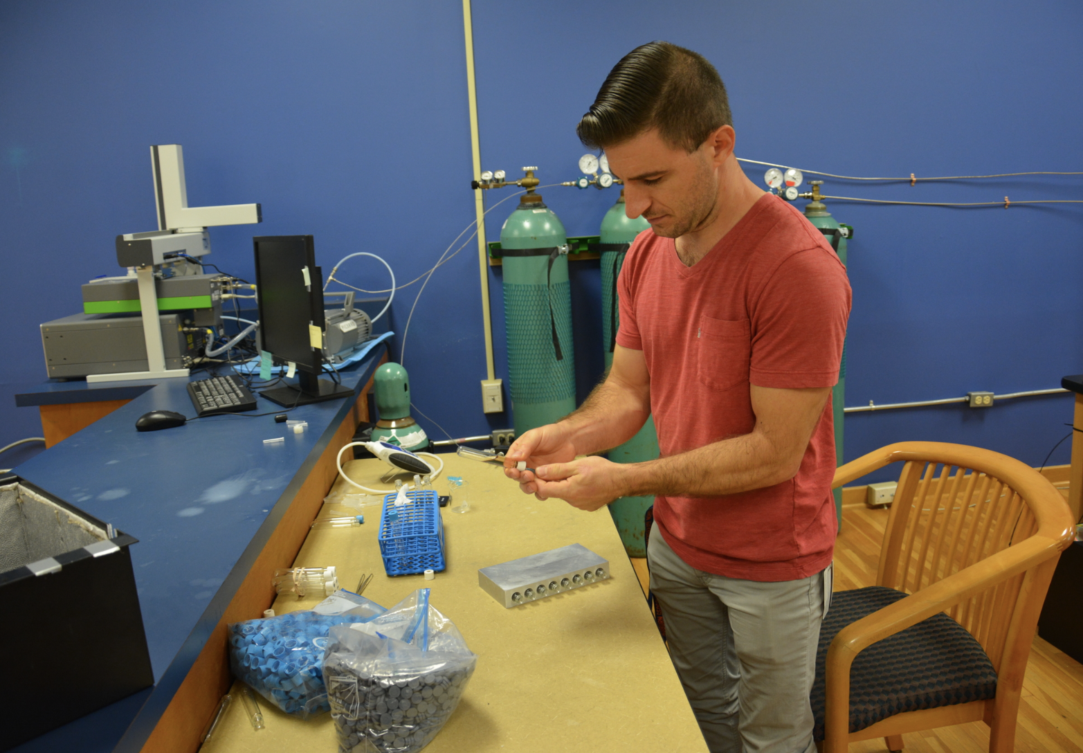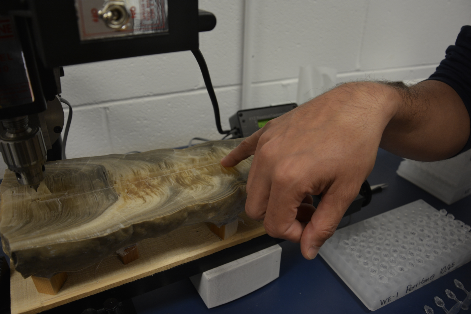 Dr. Matthew DeCesare, the lab manager in the Medina lab, explained the process of analyzing stalagmites. It involves drilling tiny holes at every millimeter of the stalagmite for samples, which are then put in vials. Dr. DeCesare then reacts the samples with a small amount of acid, turning them into CO2 gas, which is injected into a mass spectrometer to collect isotopic data. The isotopic ratios of the sample allow reconstruction of what the climate was like during the time period when the stalagmite was growing. The stalagmites Medina and DeCesare collect are from Mexico, Cuba, Belize and Alabama. All of the data from these four regions is integrated in order to produce a glance at the overall picture of Caribbean climate.