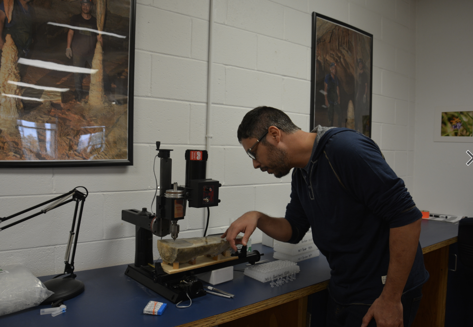 “Every cave is a library of climate and environmental information,” Dr. Martin Medina, an associate professor in the Geosciences Department of COSAM, explains. Dr. Medina’s main area of research is paleoclimatology, which is the study of past climates, and to him, caves are vital for understanding the past, present and future. Using stalagmites from caves in different Caribbean regions, Dr. Medina and his lab team are able to reconstruct past climates, dating back to hundreds of thousands of years.