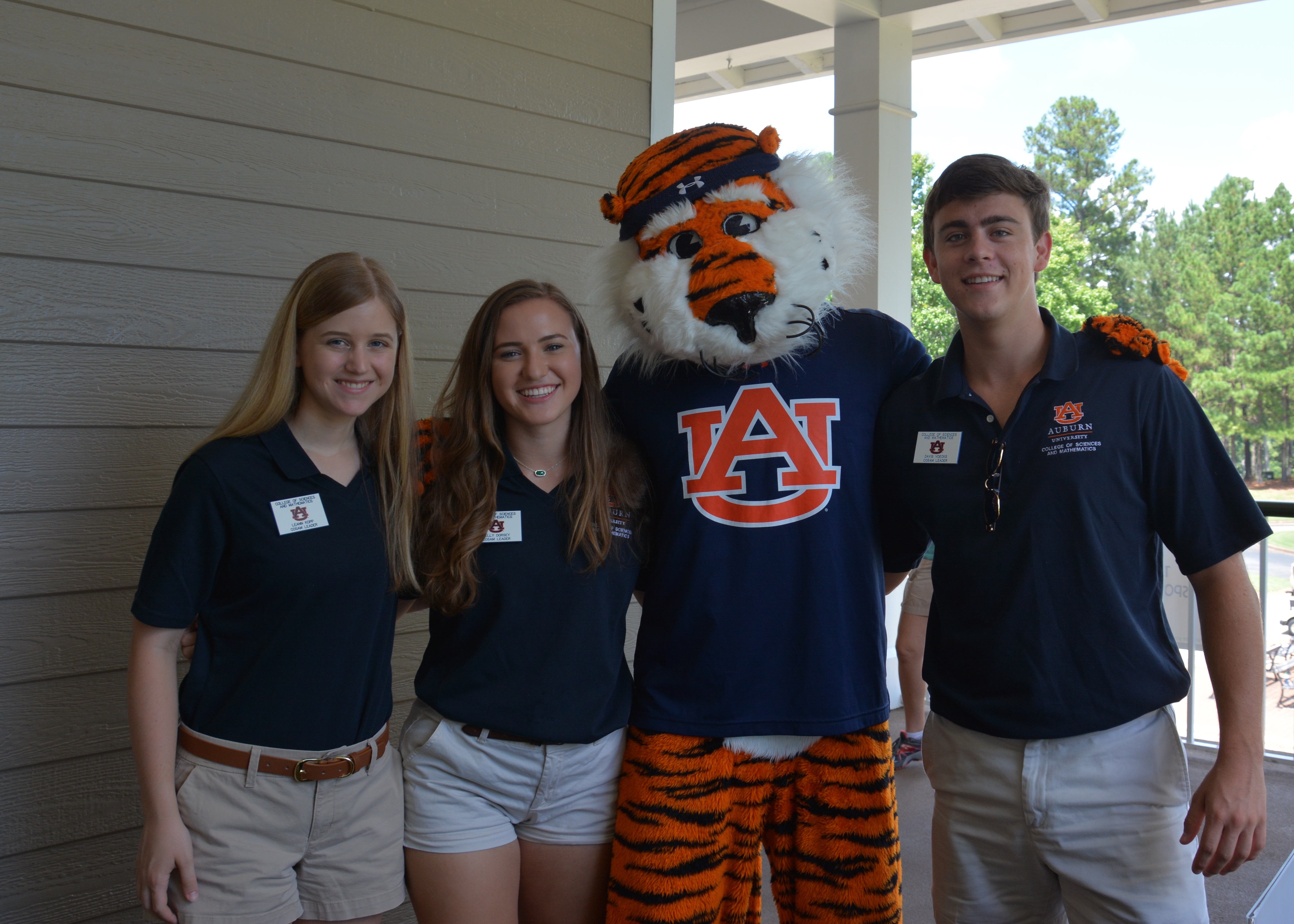 COSAM Leaders, (left to right) Leann Kopp, Kelly Dorsey and Davis Voecks, pose with Aubie at the Dean's 23rd Annual Scholarship Golf Tournament.