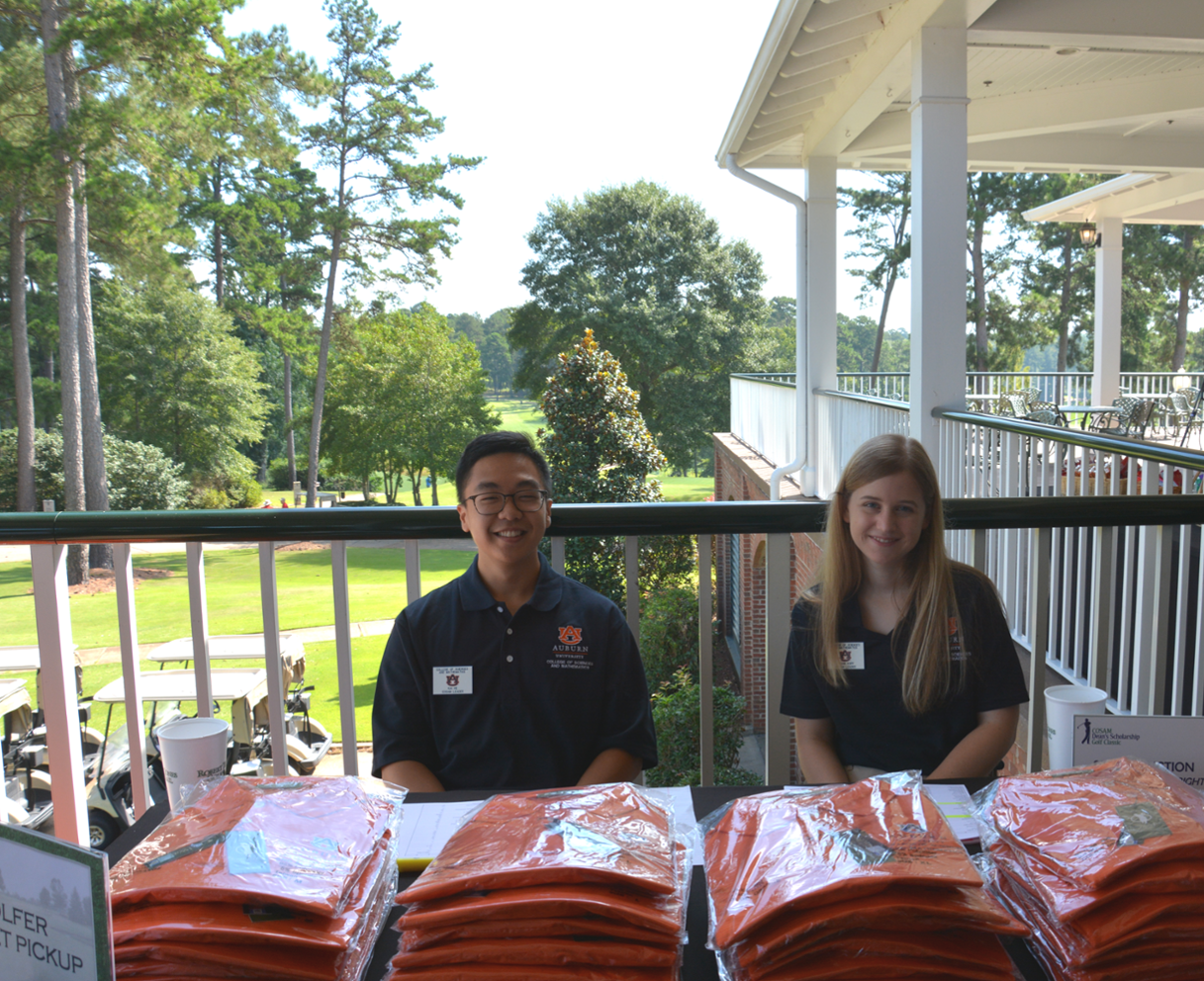COSAM Leaders Kai He and Leann Kopp registered players and welcomed guests at the Dean's 23rd Annual Scholarship Golf Tournament.