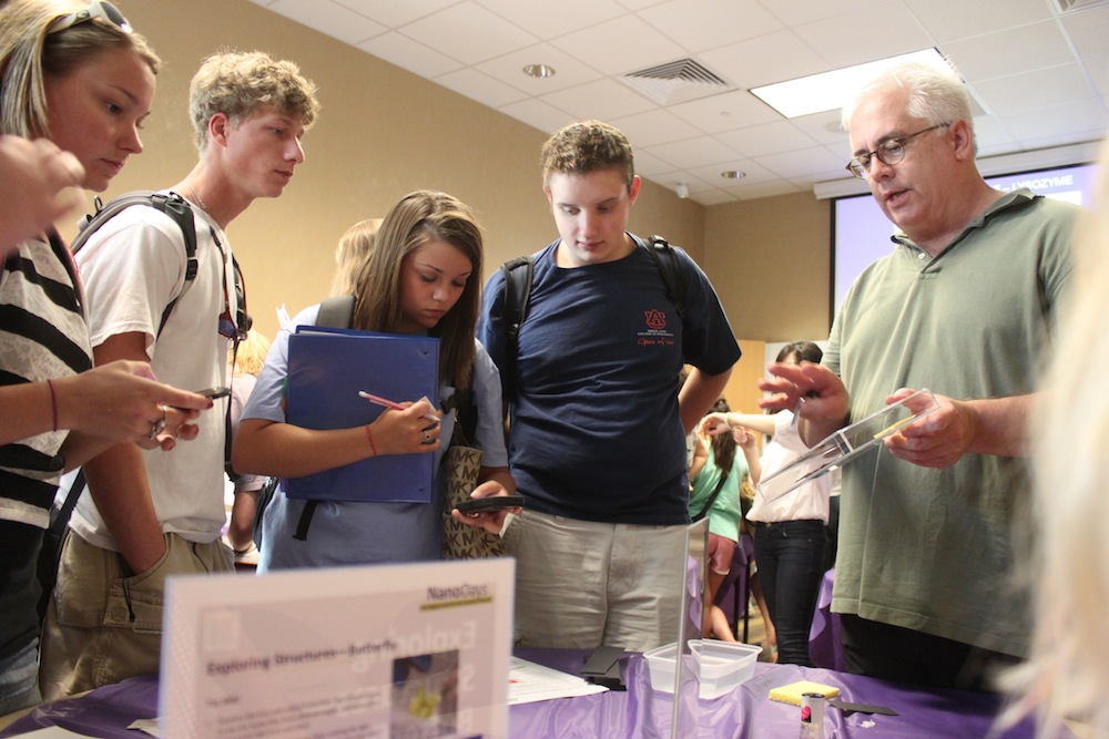Professor Curtis Shannon and Assistant Professor Christopher Easley, both of the Department of Chemistry and Biochemistry, and Associate Professor Virginia Davis of the College of Engineering, organized and participated in NanoDays on Tuesday, March 27, at the Student Center. NanoDays celebrations bring university researchers together with science educators to create new and unique learning experiences for both children and adults to explore the miniscule world of atoms, molecules and nanoscale forces. NanoDays events combined fun hands-on activities with presentations on current research. There were approximately 70 attendees who participated in the hands-on demonstrations, led by Shannon, Easley, Davis and graduate student volunteers. A variety of ages were present, from kindergarten students through college age, and the demos were well-received by all.