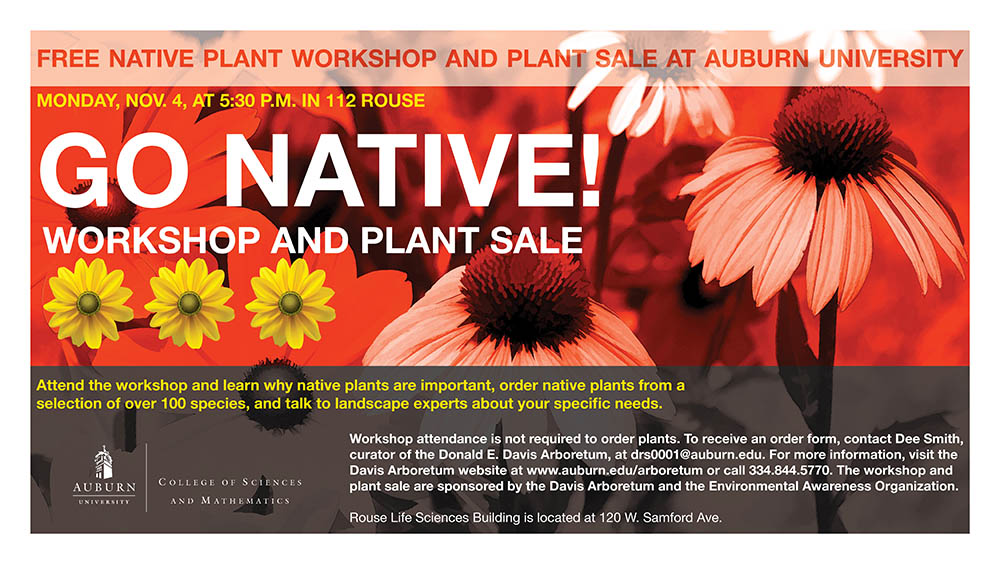 The Donald E. Davis Arboretum and the Environmental Awareness Organization, a student group dedicated to environmental awareness and sustainability, are currently hosting a native plant sale. A list of native plants and order forms are available on the Davis Arboretum website. All orders must be placed by Monday, Nov. 11. Plants will be available for pick-up during the week of Nov. 18-22. To request a plant list and order form via email, contact Dee Smith, curator of the Davis Arboretum, at drs0001@auburn.edu or call 334.844.5770.