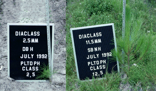Both slash pine (Pinus elliottii) seedlings were operationally planted using machines on October 16, 1991. The root-collar diameter (RCD) of the small seedling was 2.5 mm at time of planting and the seedling was planted 2.5 cm deep (i.e. root-collar 2.5 cm below groundline). The large seedling had a 11.5 mm RCD and it was planted 12.5 cm deep.