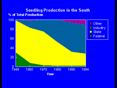 In the early days, seedling production was mainly at federal nurseries. However, production at state nurseries increased and by 1964 the Ashe Nursery in Mississippi was the last federal nursery in the South. Currently, industry now produces over 60% of the seedling production and several private nurseries produce more than 10% of the production.