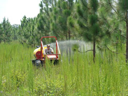 Forest herbicide application is another important management tool at the Center. Chemicals may be applied by hand, ground or air and are often used prior to artificial regeneration of pines, to shift understory vegetation from a less to more desirable community or as general brush control along fences and roadsides. When used correctly forestry herbicides are generally safe and target specific.