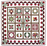 Quilting can be around the motif as in Echo quilting, or in ½” to 1” cross hatch quilting. This is an example of the Baltimore Album quilt revival, popular from the late 1980s to the present. |