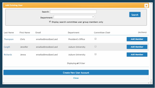3. Search for the employee by name. Select Add Member to add them to the search committee. Check the box for Committee Chair if appropriate.