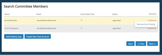 To remove committee members, hover over the Actions link and select Remove from posting.