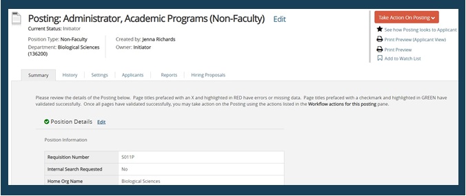 2. When users are ready to submit the posting for review, hover over the orange button that says Take Action on Posting.