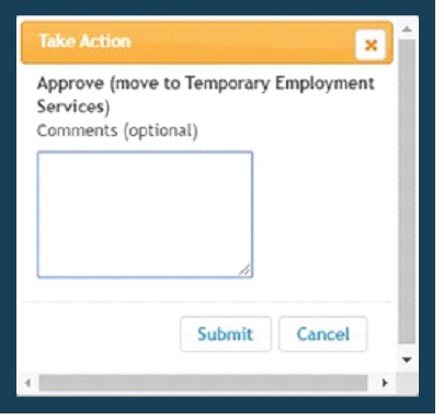 2. When users are ready to submit the hiring proposal for review, hover over the orange button that says Take Action on Hiring Proposal.
