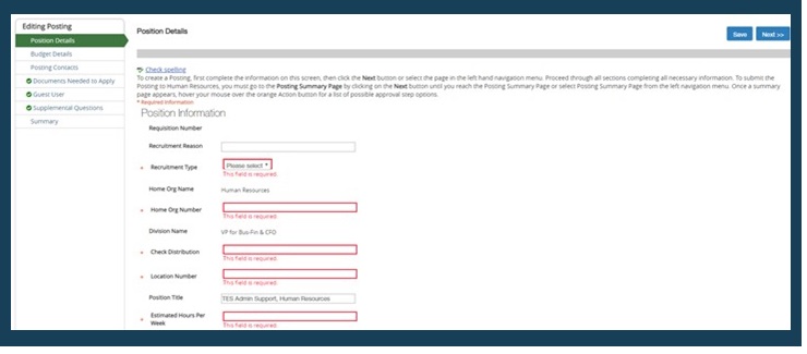 5. Complete all required fields on the Posting Details, Advertising & Budget Details and Posting Contacts pages. To progress to each page, use the Next button, or navigate using the sidebar menu.