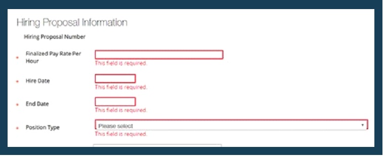 There will be a few required fields to complete (Finalized Pay Rate Per Hour, Hire Date, End Date, Position Type and Will this position be responsible for driving a University vehicle?). These fields will be notated by an asterisk and red outline. The form may not be submitted until these fields are completed.