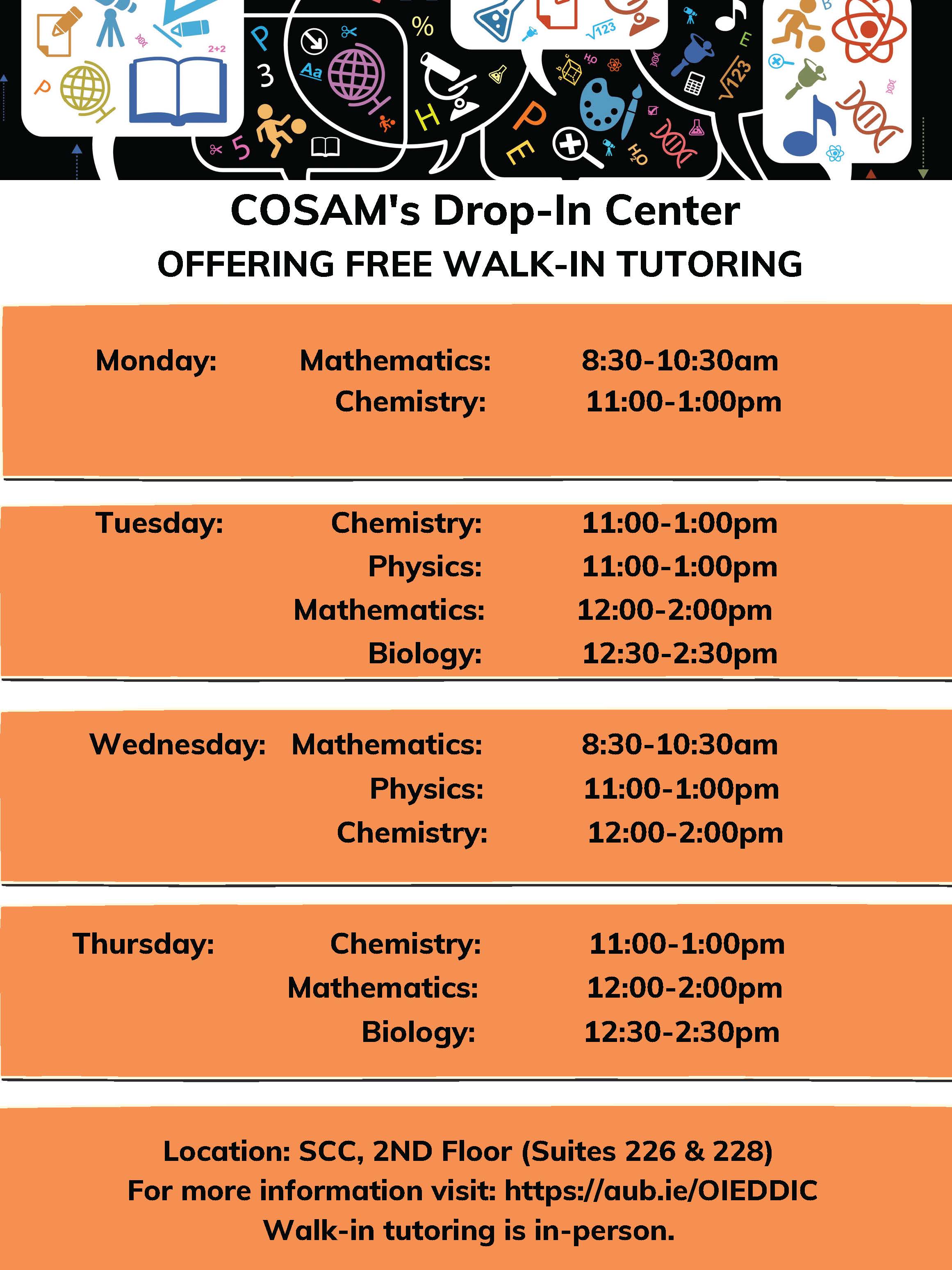 The COSAM Drop-In Center, established in 1994, occupies rooms in the Science Center Classrooms Building including staff offices and study/workshop rooms. The Drop-In Center, housed in the College of Sciences and Mathematics Office of Academic Engagement, Innovation, and Opportunity, is the home of a comprehensive academic-support program for all students with majors in sciences and mathematics. During the school year, free tutoring is offered in Biology, Chemistry, Mathematics, and Physics.