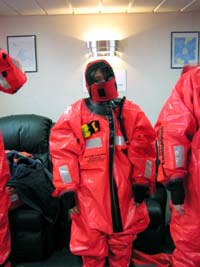 Shortly into our travels, “muster” was called to hold a Sea Safety Review. We brought our life jackets and Survival Suits from our bunk rooms to the main lounge, and proceeded to try them on. We were all challenged to pull on these all-in-one rubber-cuffed and boots-built-in giant orange Gumby suits! It gave a whole new meaning to “one size fits all” as we looked quite ridiculous, but we all knew that these suits could make the difference between life and death should an accident occur that required wearing them. We were also oriented to the location and use of lifeboats. These looked more like “pods” with their egg-shaped construction, and an entryway that was just a small watertight hatch. A marine pilot must navigate ships in and out of