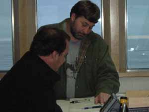 It is no small task, keeping all of these plates spinning and being sure to come home with as much sample and data as could possibly be needed for the next year and a half (Salp team comes to Antarctica again in February of 2006, Benthic group comes again in July of that year). There’s no, “Oops! Just one more thing…” once you start crossing the Drake Passage! As you can imagine, it is a huge job getting these cruises together, and shipping all of the equipment and supplies to Southern Chile in advance of loading the ship and crew. I am so impressed by the coordination and attention to detail. Some individuals of the group have done this many times, and see it as ‘no big deal’, but as a first-timer, believe me, these people are masterful at what they do. And to come onto the ship with a pack of individuals doing what they do with skill and schedules of their own – it’s like a well-oiled machine, all personalities aside and business first. (I have a feeling this is why the Palmer Station stop is left until the end, but I’ll have to wait until Friday to see how that pans out.) Ken Halanych, as I said before, is the Chief Scientist of the cruise, and every detail in scheduling sampling stops runs through him and is worked out with the Captain and the Mates or helmsmen. Ken meets regularly on the Bridge, logically, because that’s where the navigational charts are, and it is all plotted on those big maps up there. [See Image] “X” marks the spot is as true today for these Pirates of Science as it was in the past with the “Aaaaargh, Matey” pirates of yore. (A few pieces of eight coming up with those benthic tows would be much appreciated, though, wouldn’t they, Ken?) Our stops are marked with X’s and numbers, a new number given for each Research Station. As of this writing, we have had nearly 80 stations. There will likely be over 100 by the time we’re back at Punta Arenas. As for the weather, we’ve had another beautiful, flat calm evening. Lucky for us, we also have crystal clear skies, which makes for beautiful sunsets and sunrises down here (and they’re about an hour an a half apart!). Tonight was special, though, and a few ‘flash watchers’ were ready for it. Many of us have heard of the infamous ‘green flash’ that supposedly follows a clear sunset. Songs have been written and bars have been named for them. But do you know if they are real or just legend? Wehhhhhhllll, we have a winner with REAL tonight, folks!! It was not just the idle claims of sleep-drunk scope-focused no-life scientists who want to be heard in the real world, it really happened!! And there is a good reason that it is so likely to bee seen in the latitudes of the Southern Ocean – the sunsets and sunrises linger longer down here!! Modus operandi. Corpus delecti. Whatever it is, the method and opportunity are there. Here’s the summary of the rationale for the green flash phenomenon as described in the Discovery Books “Explore Your World” handbook on Weather, 1999. The “Green Flash” is the brilliant greenish coloration seen on the horizon, just above the rising or setting sun. The best conditions include a low, flat horizon, especially the ocean surface, and a clear sky (Bingo, Bingo and Bing-GO!). When the sun passes through the earth’s atmosphere, its light rays are refracted by dust particles creating a spectrum of colors (though some would argue that “clear” means clear and there must be no dust particles. We’ll have to do Prisms and the Bending of Light another day. Sun’s rays bend very nicely on a dusty prism in my house, thank you very much.). As the sun sets, those colors slip below the horizon too, starting at the red end of the spectrum. Green is the last in the series (not blue – blue particles are scattered, probably due to the blue in the sky or the ocean). In polar regions (do I hear a fourth Bingo???), more than a flash may be seen, because the sunsets and sunrises linger. (In 1929, Admiral Byrd’s expedition to Little America reportedly saw a green flash that lingered 30 minutes. Ironic that it should last longer than Little America did, is it not?) | ||||||||||||||||||||||||||||||||||||||||||||||