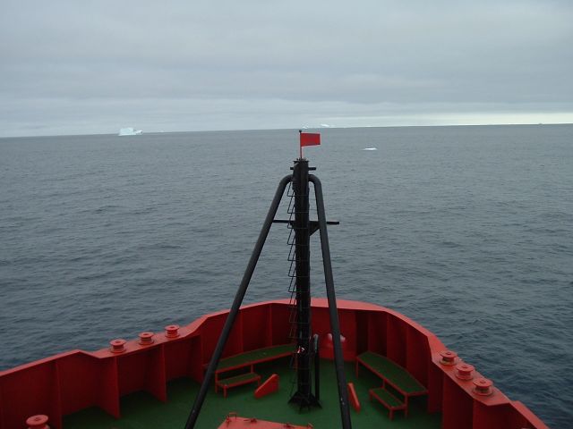 | The Great Big News today is that late in the evening Sunday and into the morning Monday, we Crossed the Line to the Antarctic Circle!! We had been creeping down on it all day, stopping for science, etc. It was a lovely, calm but overcast night, and we could see weather on parts of the horizon. | Photo1![]() |