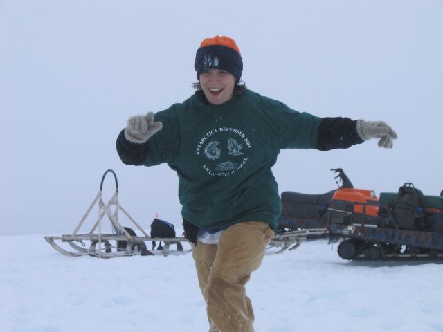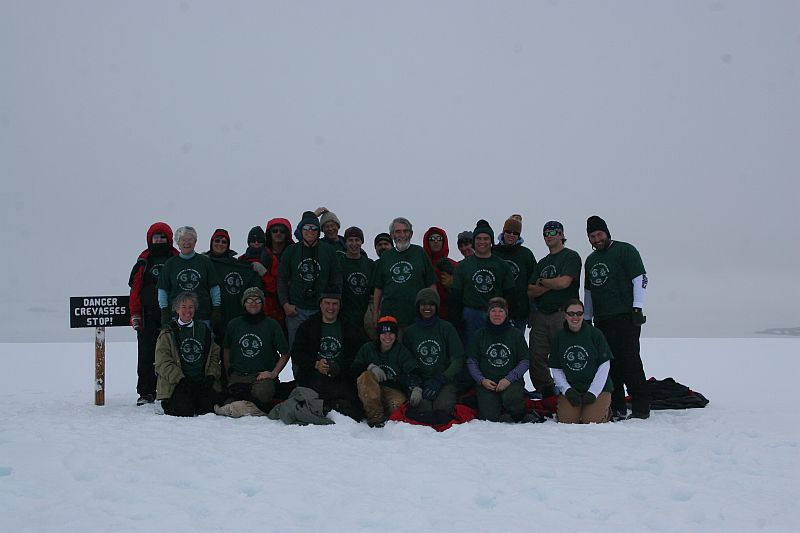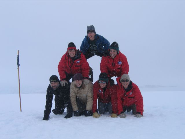Joe Pettit gave us instruction on where we could go, how to sign in and out and where get radios (walkie-talkies) to take with us if we were going to explore beyond the station campus. It’s rugged terrain here, and because it is at the foot of a glacier, it has its unique hazards. [Image 1] Once outdoors and off the ship, we explored the comfortable campus buildings and offices, including the Aquarium and science area, the dining hall, and sought out other pertinent information such as where to find the hot tub. This campus looks like the other stations we passed (only, the buildings were blue, not red), not unique in its outward character, but seemed functional and even homelike in many of its communal areas. The cast of characters there also appeared to have an air of solidarity in what could be loooooong seasons of isolation. I think of that isolation when I’m told that, although the continent has very little precipitation – averaging 4½ inches of snow per year, the peninsula has more like 25 feet of snow per year! It is the relative “rainforest” of the continent. Our directive from Ken Halanych was to “meet on top of the glacier at 3 o’clock for a group photo – and be sure to wear your 2004 Antarctic Cruise tee shirts!!” (Rudi had them made for us before we left Cape Cod). We took off in small groups to travel the .8 miles, 460 vertical feet, on our own time [Note: the coordinates at the top of the glacier are, S64 degrees 46.452minutes W064 degrees 01.391 minutes]. I have to tell you, the .8 miles doesn’t sound like much until you try it in your Raytheon-issue layers of clothing and ultimately the ‘Sorel-like boots’ which Larry Madin describes as his “clown boots” – they are a couple of sizes too wide and one size too long, and we all look pretty clunky in them! Add to that the snow conditions which today were “loose granular under thin glacial hardpack” – which means, you never know which step you take will break through and sink you up to your knees in something I would not call “fluffy”. The weather was not too cold (around freezing), but overcast with occasional blizzards (weather passed through quickly here today!), so seeing the trail markers for or from any distance was at times what we might call “compromised”. The glacier was marked, we think by a professional street sign coordinator from Boston, with black-flagged poles at regular intervals of about 20 feet, except for the part we did not find ‘regular’, and probably went outside the lines for a bit… It was important to stay within those markers for safety – glacial ice and snow shifts are unpredictable, and especially in the melting springtime season. Crevasses are not our friends. The short story from this point is that we all did make it, those energetic ones who hopped to the top by 2:30 were pretty cold by the arrival of the last, and were getting ready to draw straws on which one they would have to grill up and eat to survive the elements until Search and Rescue could find them… (Nerida - from Australia - has seen and already had enough of her first snow!) The camera arrived with a tripod, a committee was formed to figure out how to use them, and finally we were in formation by the “Danger - Crevasses - Stop!” sign. The first timed shutter release was done by Ken. Did I mention that you cannot run in this crusty breakthrough snow? Well, Ken dove and rolled into the picture after learning that running only made him break through more. Wisely, subsequent shots were delegated to the diminutive Adriene, who had some difficulty, but comically and with unbending determination, kept going back for more! [Image 2] We doffed our jackets to show the tee shirts, just as one of the blizzards let up – so we have a GREAT TEAM PHOTO!! [Image 3] The Salp Team then posed in pyramid formation for their group photo (always ‘one up’ this bunch, aren’t they?), which was very good, and then we headed back down (a much simpler terrain negotiation). [Image 4] Cafeteria trays would have been welcomed for quick transport, except for that nasty unavoidable rock formation at the bottom of the glacier… We were invited to the station for pizza dinner with blonde brownies and ice cream sundaes! It was a good opportunity to meet some of the Palmer staff. Five people are coming back with us to Chile, so we will make room for some welcome company (who would not be welcome into our friendly camaraderie?). All of them have “new” names, Katherine, Joe, Jude, Toby and Brad. We may be a bit feeble in the mind at this point in the cruise, so the challenge of names matching names we already know might be a little too much… At the stroke of 6 p.m., we were on to THE STORE. The Station Store is in a room about 16’x10’ without inventory, and with 12 or so people in there at a time, it was sardine city – but we were desperate to spend money! It was hard not to leave a mess in there (tee shirts, especially, sorry!!). After shopping, we headed over to the recreation room where ship staff mixed with science mixed with station people in a very pleasant mood. We all were grateful for the night off with loud music and non-shop talk. Many of us took advantage of our first chance since leaving Chile to phone home, from there at the station. It was a great opportunity to make some much-needed voice contact with our families. The activities that went on later in the evening and perhaps into the morning hours are left to mere rumor and speculation, as I was not in attendance. There was pool-playing and darts-throwing and music-cranking-and-dancing. | ||||||||||||||||||||||||||||||||||||||||||||||