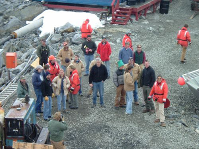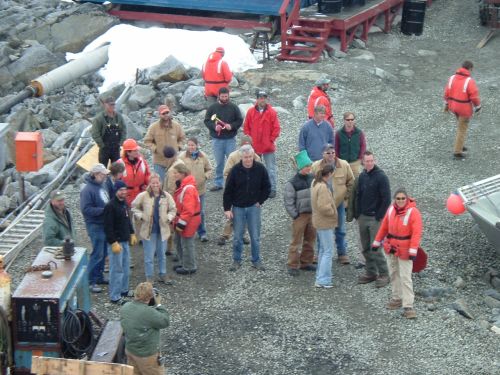 | We departed Palmer Station at about 10:30 a.m. in sort of gray skies, but with a definite air of celebration. This is the last leg of our journey, the beginning of the trip home. We now have 5 of the Palmer staff of 42 with us, so a bugle was blown at Palmer to beckon all of the hardy souls | Photo1![]() |