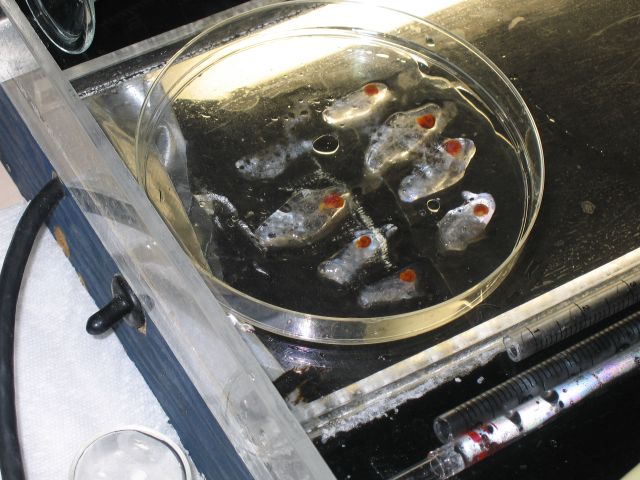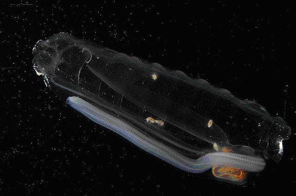 | To have to pack up the details in rough weather would have been prohibitive and we might have had to save a lot of it to do once we were tied up at the dock again. This is a blessing, and has everyone, tired as we may be, in very good spirits. Of course, the constant re-supplying of homemade cookies is a huge help!! Some of our plankton tows are the usual nets we set out with the ship moving 1-2 knots. But we are trying a few “drift tows” as well, where the ship’s propellers are set in idle, and we actually drift with the sea for about a half hour, and the net is about 35 meters down. Will Jaeckle has gotten some very nice samples using this method, and we’re hoping to make a comparison between this method and the method where the plankton are …pushed… into the cod end net with a bit more force. (Will compares this ‘under power’ method to a human’s being forced into a chain link fence with a firehose. He does a nice impression of the larvae point of view [See Image 1].) Unfortunately, we are heading into a pretty dense phytoplankton zone (remember, dun-dun-daaaaahn, phytoplankton bad, zooplankton good?), so the nets are skimmed with green slime. Green slime translates into pureed spinach soup consistency sample in microscope dishes, and that makes for some difficulty finding microscopic critters. You’ve heard of finding a needle in a haystack? Well, this gives that a whole new meaning. One thing that has been bountiful in this neck of the woods (an abstract term for me, remember, I haven’t seen a tree in four weeks!!) is ….Salps! One plankton netful brought up more salps than we could fit in a bucket. And although the Salps Lab had for the most part been packed away, those folks jumped out of bed and started it all over again. Never enough salps! (I think they’re possessed!!) …Which leads me to my next installment of “Meet the Scientists” written by Dr. Larry Madin of the Woods Hole Oceanographic Institution. Salp Project on LMG04-14 One species of salp, Salpa thompsoni, is often very abundant in the plankton during the austral summer around Antarctica. They may compete with krill, the shrimp that are the other major herbivore in the Southern Ocean and have been studied much more than salps. During this cruise we located populations of Salpa thompsoni, collected them alive, and made measurements in the laboratory of their feeding, metabolism, growth and reproduction. As they are fragile and damaged by usual methods of collection involving nets [See Image 4], our main tool for collecting live salps is blue-water SCUBA diving. A team of 4 divers, wearing special dry suits for protection against the freezing water, dives from a small rubber boat away from the main ship. They look for the salps swimming underwater, and collect them in plastic jars to bring back alive to the ship. Our dives this trip provided hundreds of healthy salps up to about 14 cm (5 ½ inches) long. We ran experiments to measure how much they ate and their metabolic rates, and were able to keep some alive in the ship’s laboratory for two weeks to see how fast they grow. The salps are quite hardy and survive well in buckets and tanks of cold seawater. We also counted and measured many salps collected in a large net from different locations and will use this information to understand how the population is growing. [See Images 5 & 6] By measuring the amount of chlorophyll in their stomachs, we can estimate how much algae they have been eating. Combining this information with the algal stock in the water, we can calculate the importance of the salps as grazers in the regions where we found them in abundance. Our measurements of defecation rate will enable us also to calculate the importance of salps to the vertical flux of organic matter from the upper water column to the bottom. Our results will help us understand how salps in Antarctica can be so successful and abundant in the cold but rich ocean around Antarctica. We think that their efficient way of feeding and their ability to reproduce quickly are important parts of their adaptation. They are beautiful and fascinating creatures and we were glad to find so many to study on this cruise. We will return next year for a second cruise to investigate these animals. We plan to build on what we have learned this trip to increase our understanding of the ecology and population dynamics of Antarctic salps by including more sampling of their vertical and horizontal distribution. The Madin/Kremer lab here is also staffed by Erich Horgan, Larry Madin’s Research Associate and ‘right hand man’ here and at WHOI; Jeff Godfrey from UConn, Dive Safety Coordinator,; Kerri Scolardi, grad student specializing in the study of ctenophores; Brennan Philips, UConn grad student; and Sandy Williams of WHOI, diver and engineer in the generation and analysis of important data. All of these people are divers, and able on-call laboratory personnel as well.