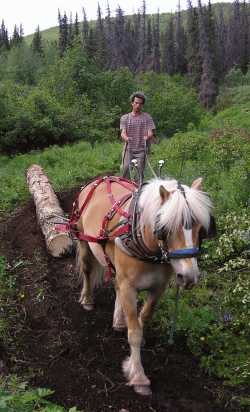 Dan Elsberg and “Lily” moving logs to the cabin site in Alaska