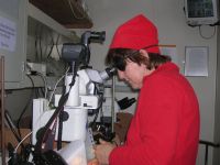 I had the pleasure of assisting Susie Balser in the photo lab as she took microscope photos of some interesting plankton specimens. One of these that you've seen before, the pilidium larva that turns into a ribbon worm, was being particularly cooperative. We were able to watch, through the lens of the camera, a pilidium ‘give birth’ to a tiny ribbon worm!! Part of the ‘gut’ in that almost clear helmet-shaped larva, is really a tiny worm forming. Susie caught one whose worm juvenile (the larva is really the “baby”) was ready to crawl out of it’s developmental home. Over the course of about 45 minutes and several gentle phrases of encouragement (things like “come on, we’re friendly” and “if you come out, you'll be famous!”), drops of water to give it more ‘space’ to work in, and extreme patience, that little worm with his tiny yellow eyes (photoreceptors) and big goofy grin wriggled free of it’s shelter and went on its way (to get a job, I presume. This thing developed so quickly, I expect by this morning he was already going to college!).
