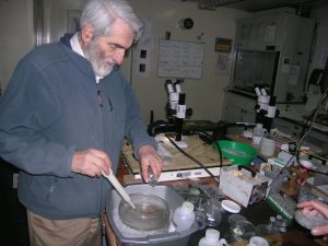 Rudi, hands on as always, sorting the last plankton tow of this cruise. [Photo by Ellen Bailey]