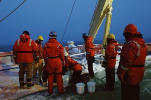 A section of profiles is useful to know when the ship has crossed a front and, in our case, when the scientists can expect to find different animals in the water. In this illustration,the section is arranged as though you are looking from the Atlantic into the Pacific with Antarctica to the left. We are looking for the Polar Front, where the warmer waters of the north meet the colder waters of the south. Warmer water to the right (north) is less dense and would be expected to float slightly higher, even on top of, the colder water to the left (south). But the rotation of the earth in the southern hemisphere causes this southward flow to ‘turn left’ and the warm water meeting the cold water creates a vertical Front. From the section you can also see that the coldest water, around 0°Celsius, is at the surface. It is expected to be dense because of its lower temperature and should therefore sink, but because it doesn’t, then it must be less salty than the warmer water beneath it. One cause of this might be, this is early winter in Antarctica and some ice melt from the summer and fall could have made the cold water slightly more fresh, to produce this cold layer of water.