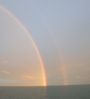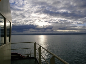 Along the way, the sun was silver behind a bank of very interesting layers of clouds, and shone silver on the waters of the Strait. It spit rain most of the day even in that silver light, and as the sun sank below the clouds and shone golden for a radiant sunset, it delivered us a full rainbow - no, a double rainbow with the most brilliant colors I’d ever seen! We were like ants between hills, running back and forth on the ship to see the sunset off the bow, the rainbows off the stern.