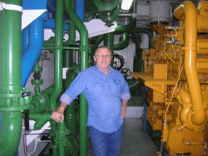 We’ve been looking for the right time of day and condition of ocean to arrange tours of the Engine Room. I was glad when Chief Engineer Paul Waters offered to take the first interested parties early this afternoon. Janis Umschlag and I were in for a real treat!!