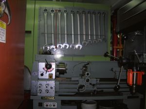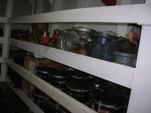 He might as well have offered white gloves as well! That engine room, at first sight visible from the Control Room through plexiglas windows, was pristine. We passed through the heavy door into the first chamber of the whole system, and the deep bass noise consumed all other. Although Paul succeeded at times to tell me things in short sentences, I still had to have the earpiece partially covering my ear. But what an education it was!! Many of the large steel vessels (housing moving parts in oil, mostly) were painted and polished white and yellow. These housings are clean so that even the slightest leak of oil could be easily and quickly seen. White Glove Test #1. Other parts, like the water and gasoline purification systems (don’t worry, they’re separate) were shiny steel and blue or yellow respectively, salt water things are green and firefighting compressors and their associated pipes were painted red. Onward. There is a full tooling room with lathes and drills and the biggest set of wrenches you ever saw (Janis mentioned the sensation Alice in Wonderland must have had when she took the pill that made her smaller.) White Glove Test #2 the tool bench. And it didn’t look as if nothing had ever been fixed there, just that everything was cleaned afterward (ed. note: Fred). The next chamber had storage for parts upon parts upon parts. Everything labeled, everything catalogued Paul said they had 2,700 parts in the inventory, and they had to know where they all were - and quickly.