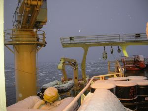 The Plankton Team brought in a very icy net this morning. It was slush, really, that had perhaps been mixed into deeper water by the propellers, then picked up by the net as it approached the ship. That was the downside of the operation. The upside was that this turned out to be the most diverse sampling of any tow so far on this trip! This means they put up more vials (little capped tubes for later viewing) with different kinds of critters in just this one tow than they’d done before. Diversity! One of their finds was a juvenile sea cucumber with a new type of ‘design’ in its calcium carbonate (hard) deposits they were shaped like wagon wheels! Izzy Williams was very excited about this, and if I’m lucky, I can put a microscope picture of it in a later Journal.