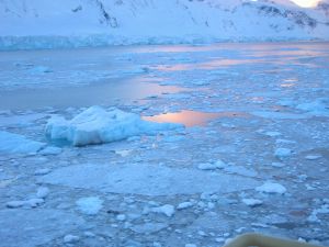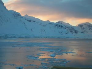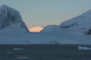 True colors the Sunset sky reflects in the waters of the Neumayer Strait. [Photo by Ellen Bailey]