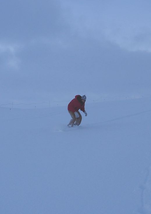 Jonathan Craft takes a snowboard ride down the glacier at Palmer Station. [Photo by Janis Umschlag]