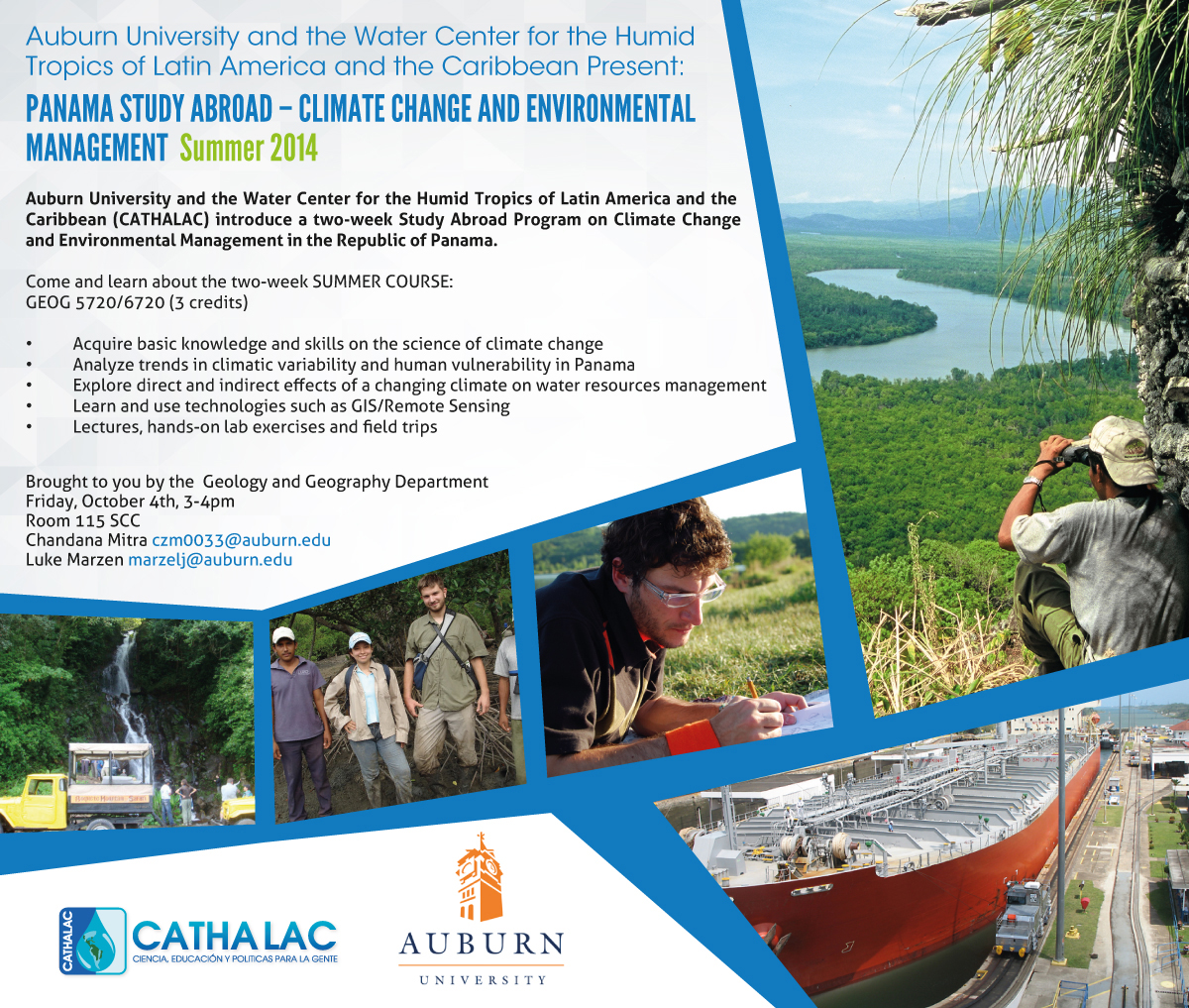 A new study abroad program is now available to Auburn students in the Republic of Panama called “Climate Change and Environmental Management.” A seminar detailing the new study abroad opportunity will be held on Friday, Oct. 4, from 3 to 4 p.m. in 115 Sciences Center Classrooms Building. The course will take place in summer 2014 and is co-sponsored by the College of Sciences and Mathematics’ Department of Geology and Geography and the Water Center for the Humid Tropics of Latin America and the Caribbean. Those who participate in the course will gain basic knowledge and skills in the science of climate change; analyze trends in climatic variability and human vulnerability in Panama; explore direct and indirect effects of a changing climate on water resources management; and learn to use technologies such as GIS and remote sensing. For more information, attend the seminar or contact Chandana Mitra at czm0033@auburn.edu or Luke Marzen at marzelj@auburn.edu. |
