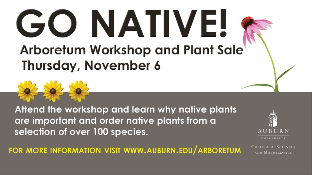 The Donald E. Davis Arboretum in Auburn’s College of Sciences and Mathematics will co-host a free native plant workshop on Thursday, Nov. 6, at 5:30 p.m. in 112 Rouse Life Sciences Building, located at 120 W. Samford Ave. Attend the workshop and learn why native plants are important, and order native plants from a selection of over 200 specimens. There is no fee to attend the workshop, and attendance is not required to order plants. To receive a plant order form, contact Dee Smith, curator of the Donald E. Davis Arboretum, at drs0001@auburn.edu. For more information, visit the Davis Arboretum website at www.auburn.edu/arboretum or call 334.844.5770. The workshop and plant sale are sponsored by the Davis Arboretum and the Environmental Awareness Organization. |