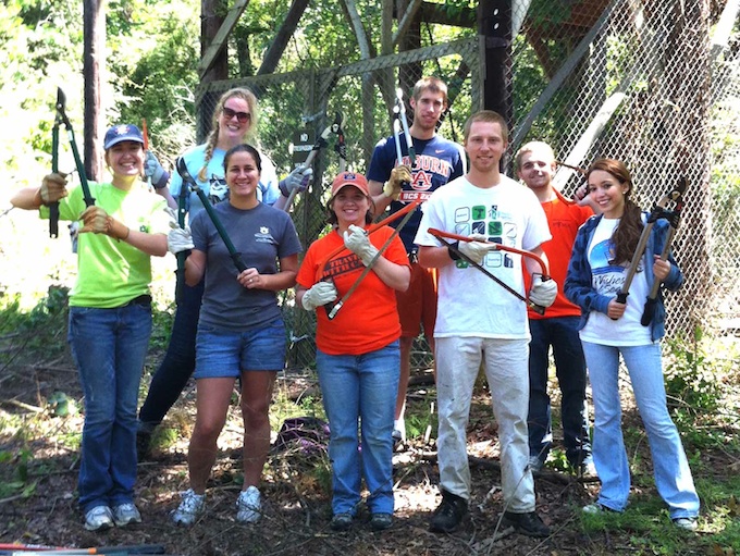 Eight members of Auburn University’s chapter of the Society for Conservation Biology (SCB) joined Dr. Sharon Hermann of DBS and Dr. John Kush from Forestry and Wildlife Sciences for several hours of alien plant removal on Sunday April 22 (Earth Day 2012). The group enjoyed surprisingly cool weather and got a lot of plant removal done on a site on campus that is being restored to its native longleaf pine habitat type.