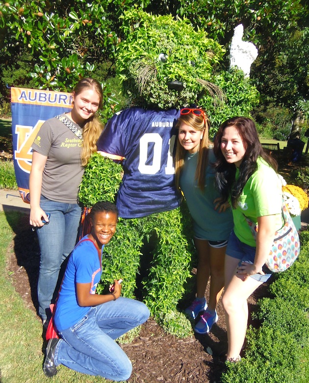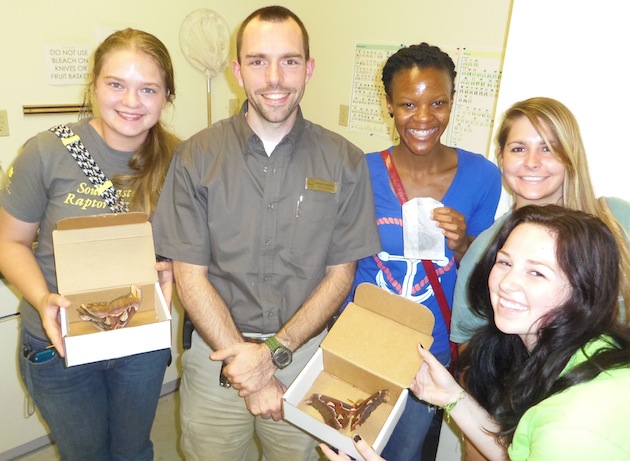 On a beautiful Fall Saturday (September 28), 4 SCB student members traveled to Callaway Gardens in Pine Mountain Georgia accompanied by advisor Bob Boyd and DBS faculty member and SCB supporter Sharon Roberts. After first stopping for lunch, we saw the Raptor show put on by staff members and then were treated to a behind-the-scenes tour of the Raptor Facility, led by Manager Laura Mirarchi. We then went to the Day Butterfly House, where former AU student and current Manager Michael Buckman gave us a behind-the-scenes tour of that facility. Michael also gave students specimens (deceased) of some of the gorgeous moths or butterflies displayed at the Butterfly House: best souvenirs ever!