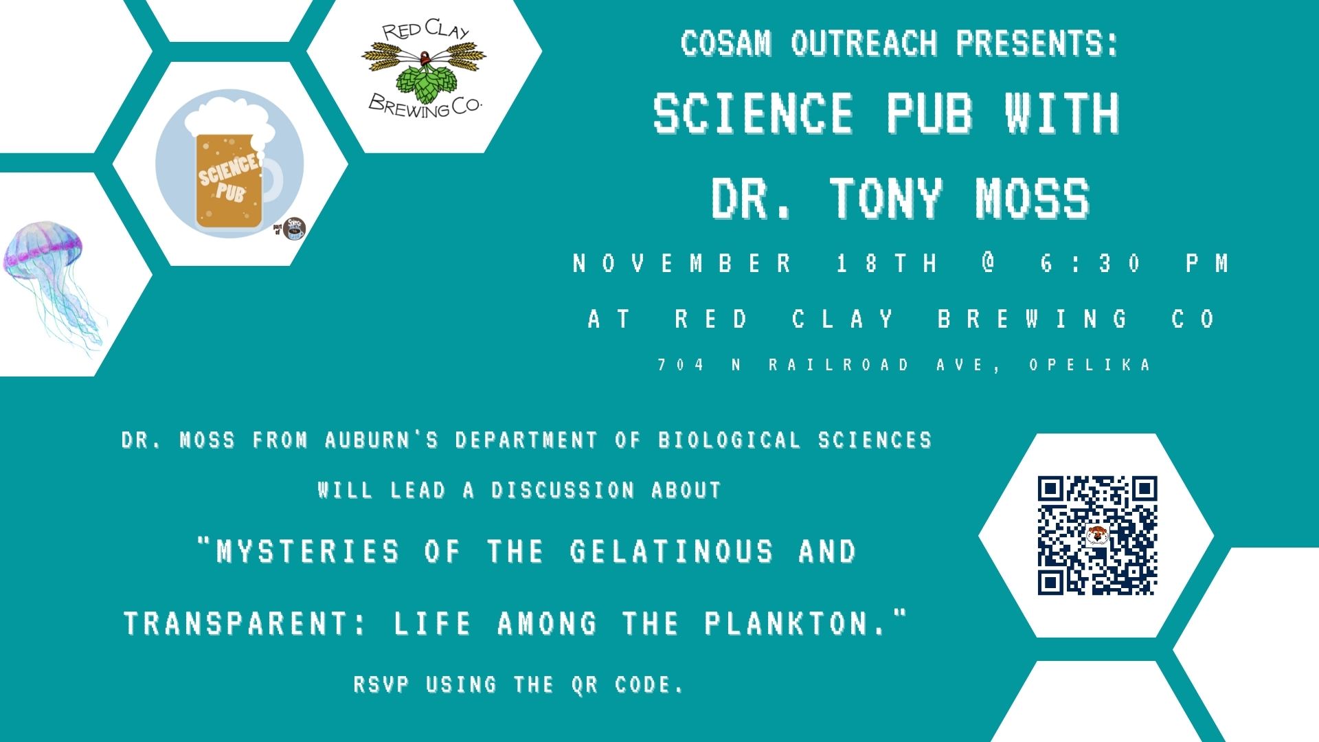 Science Pub - November 18 at 6:30 p.m.COSAM Outreach invites you to the final Science Pub of the Fall season! On Thursday, November 18 at 6:30 p.m., Tony Moss from the Department of Biological Sciences will lead a discussion centered on the “Mysteries of the gelatinous and transparent: Life among the plankton." | |